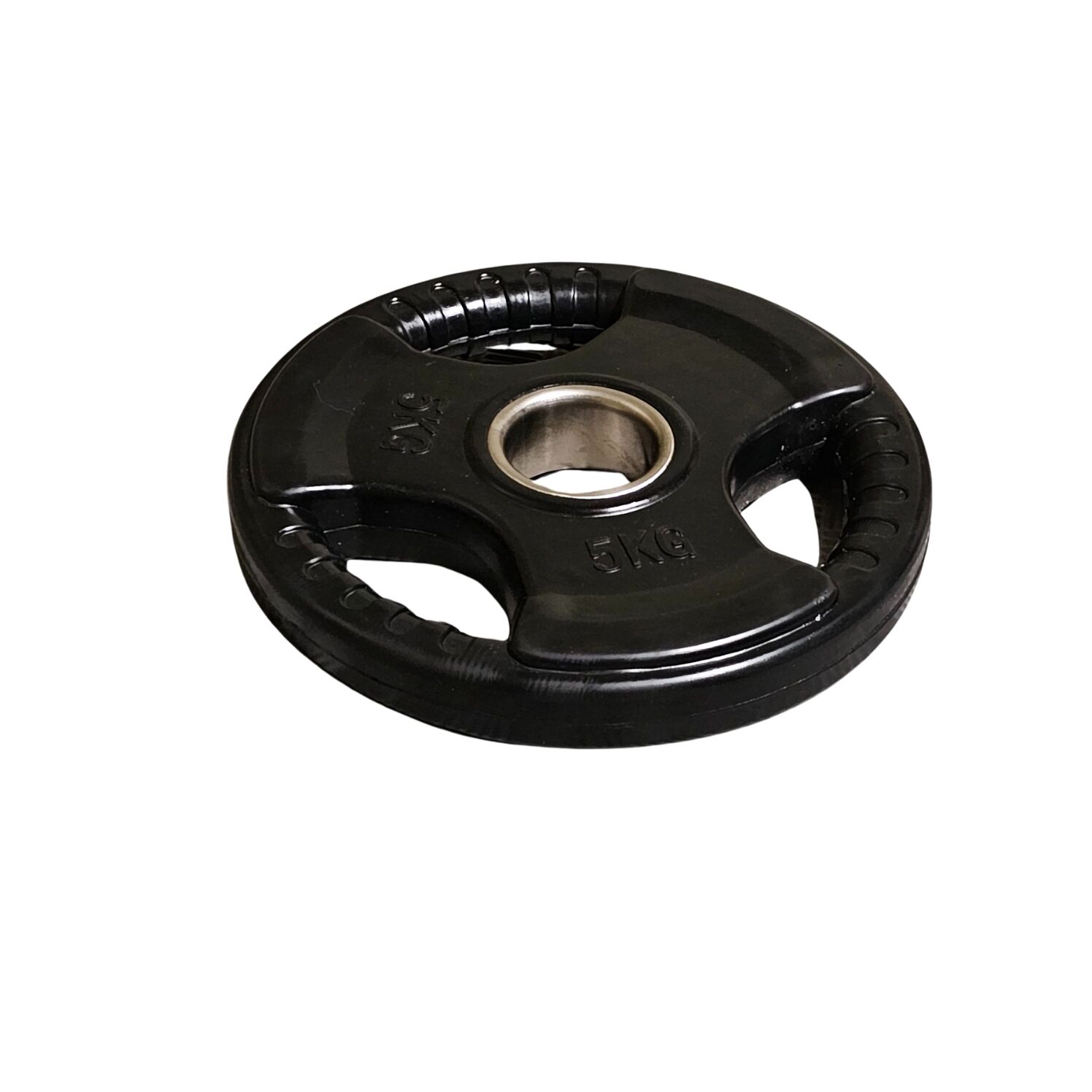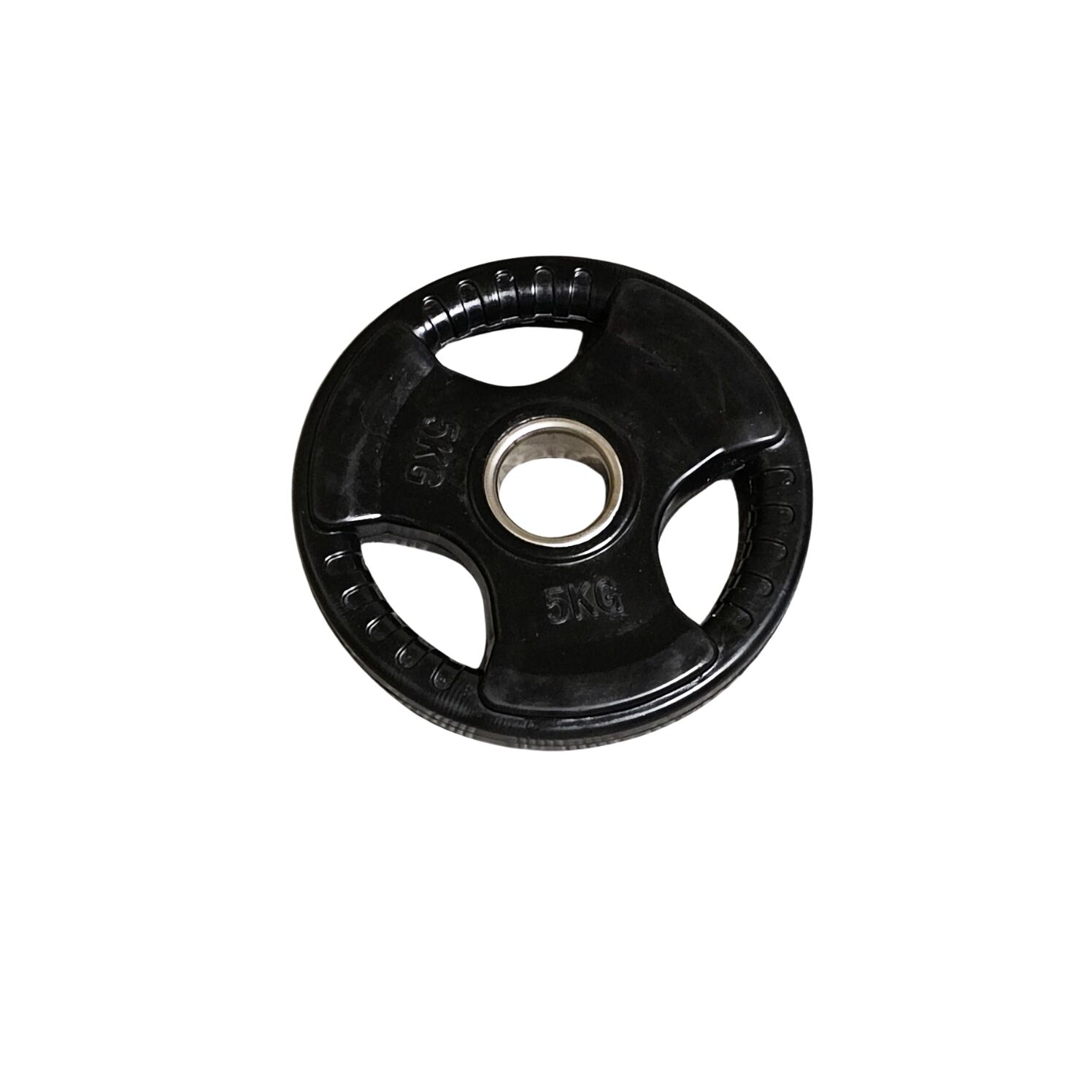 5kg gummiert olympisk vektskive. Diameter hull: 50mm. Ytre diameter på skiven = 24cm, tykkelse: 4cm. Minste kjøpskvantum: 2 stk