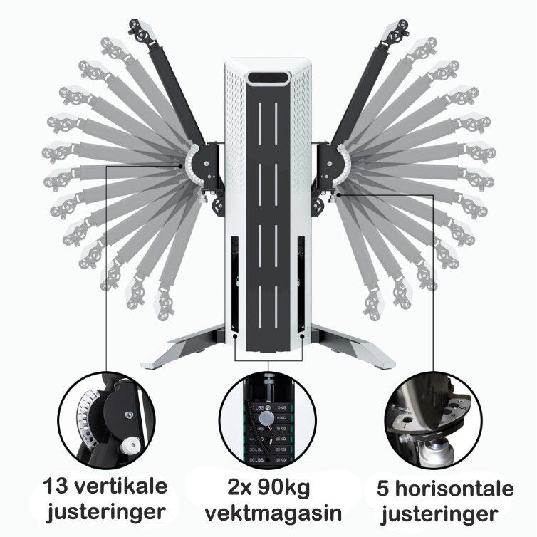 Meget fleksibel cablecross multiapparat hvor hver arm har utallige innstillingsmuligheter som gjør at hver bruker kan treffe akkurat den posisjonen de ønsker under trening. 2x 90kg vektmagasin.