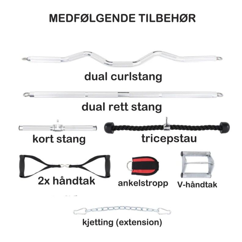 Medfølgende tilbehør: dual curlstang, dual rett stang, kort stang, 2x håndtak, ankelstropp, tricepstau og V-håndtak.