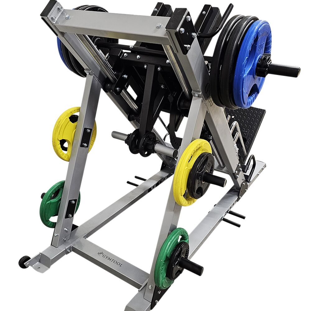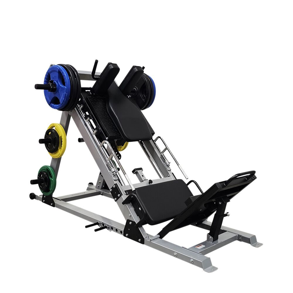 Profesjonelt benpress apparat med dual funksjon for sittende og stående benpress. Inkluderer 207,5 kg olympiske vektskiver og tåhev-modul. Solid og stabil maskin for tung beintrening. Mål: (L×B×H) 230 × 100 × 150 cm.