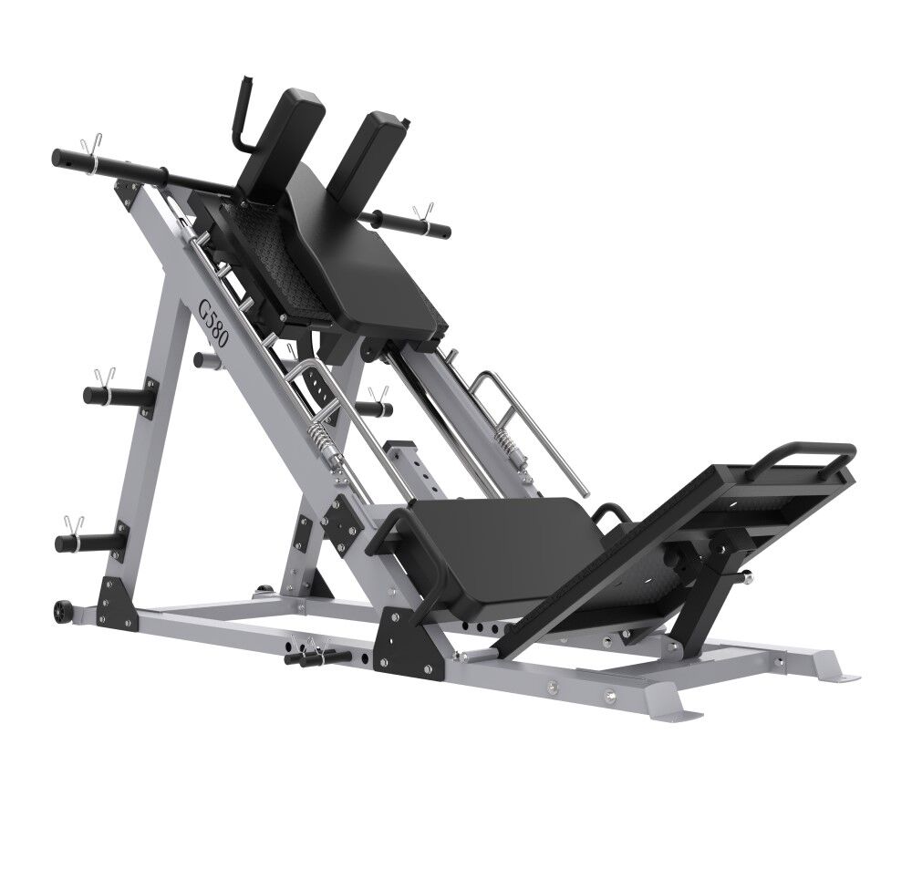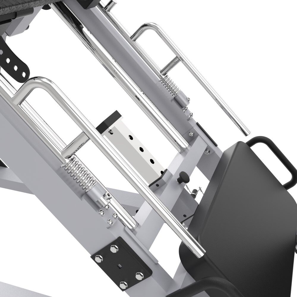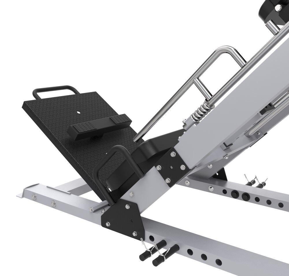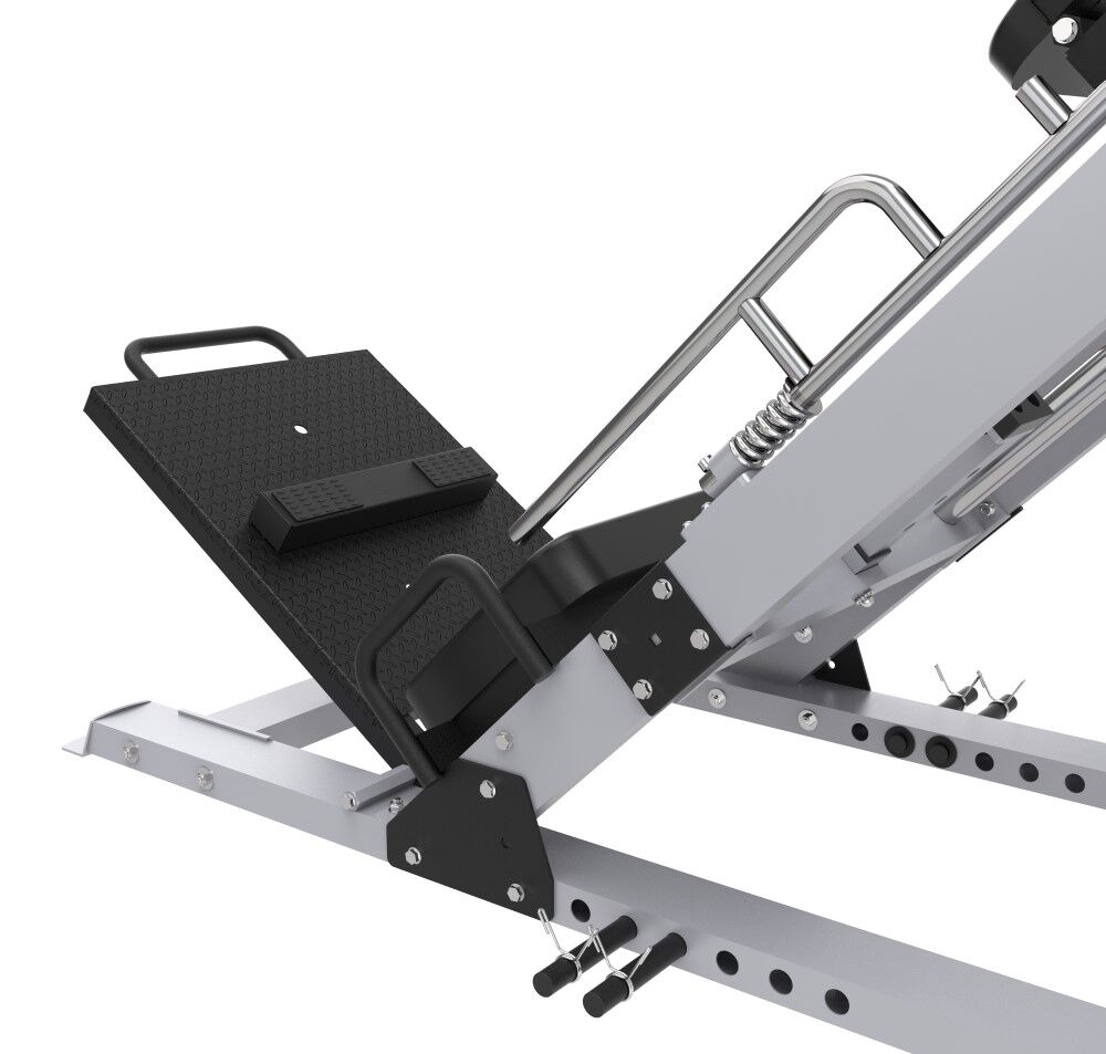Sittende og stående apparat til benpress/knebøy og tåhev. Modul til tåhev medfølger, og stilles enkelt inn i ønsket høyde og monteres/fjernes raskt i selve fotplaten på apparatet. Dette er et meget solid og gjennomført apparat med egenvekt på 190kg. Lastepinner for olympiske vektskiver både foran og bak (totalt 4stk) for økt lasteevne for de som måtte trenge det. Apparatet kommer også med integrerte strikkfester, og har integrert justerbar sikkerhetsstopper med 5 høydenivåer for større sikkerhet.