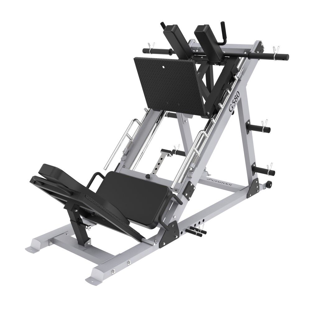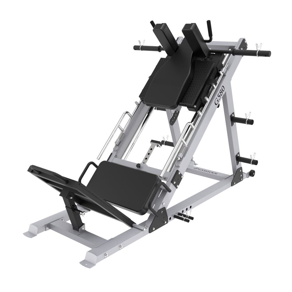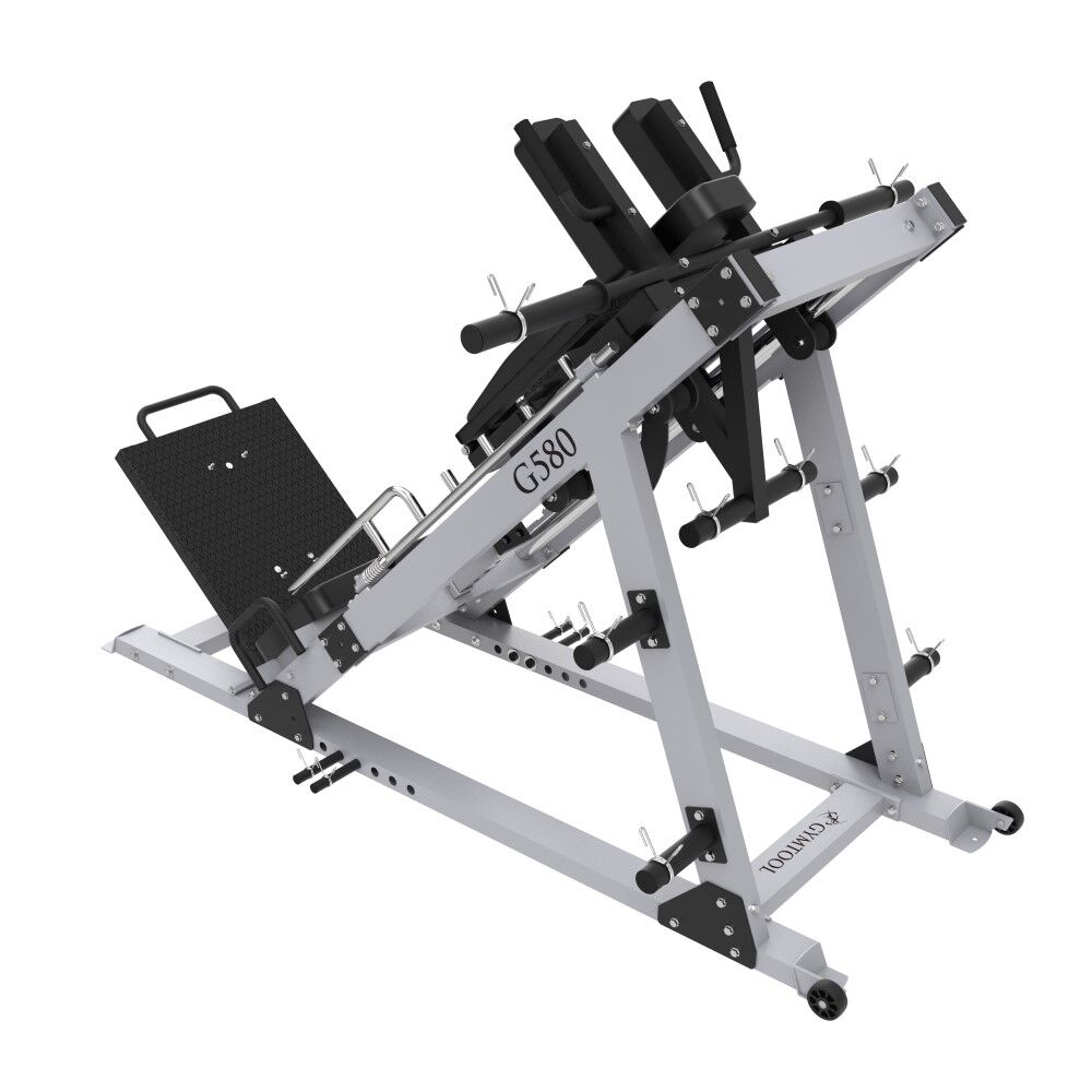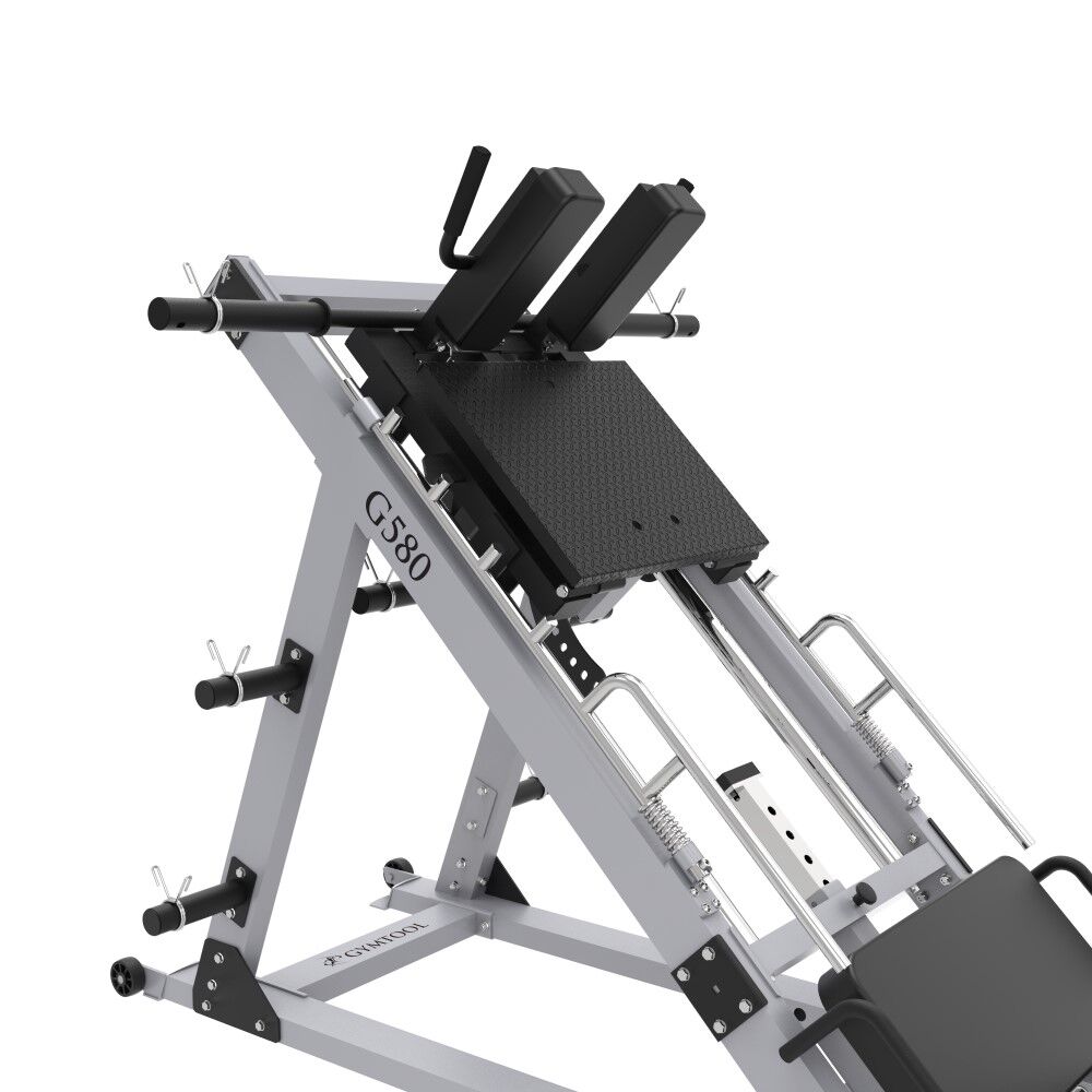 Sittende og stående apparat til benpress/knebøy og tåhev. Modul til tåhev medfølger, og stilles enkelt inn i ønsket høyde og monteres/fjernes raskt i selve fotplaten på apparatet. Dette er et meget solid og gjennomført apparat med egenvekt på 190kg. Lastepinner for olympiske vektskiver både foran og bak (totalt 4stk) for økt lasteevne for de som måtte trenge det. Apparatet kommer også med integrerte strikkfester, og har integrert justerbar sikkerhetsstopper med 5 høydenivåer for større sikkerhet.