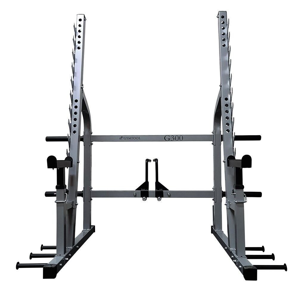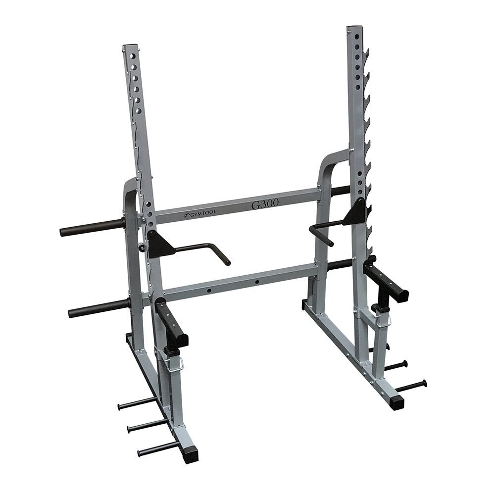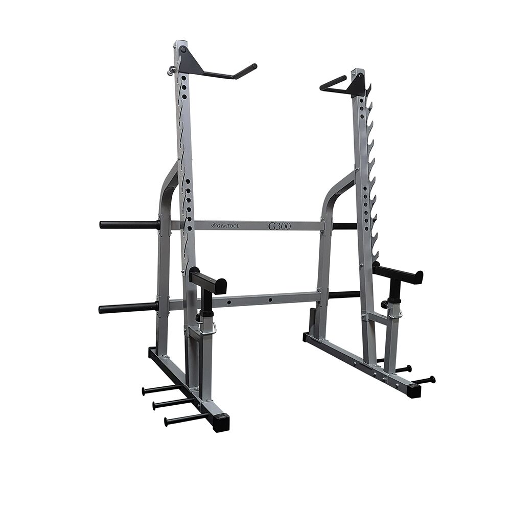 G300 har justerbare sikringsarmer, integrert lagring for vektskiver og vektstang, samt håndtak til dips og pullups.