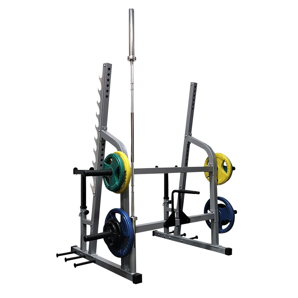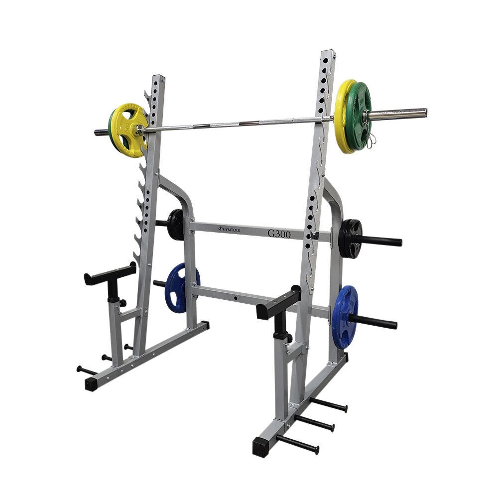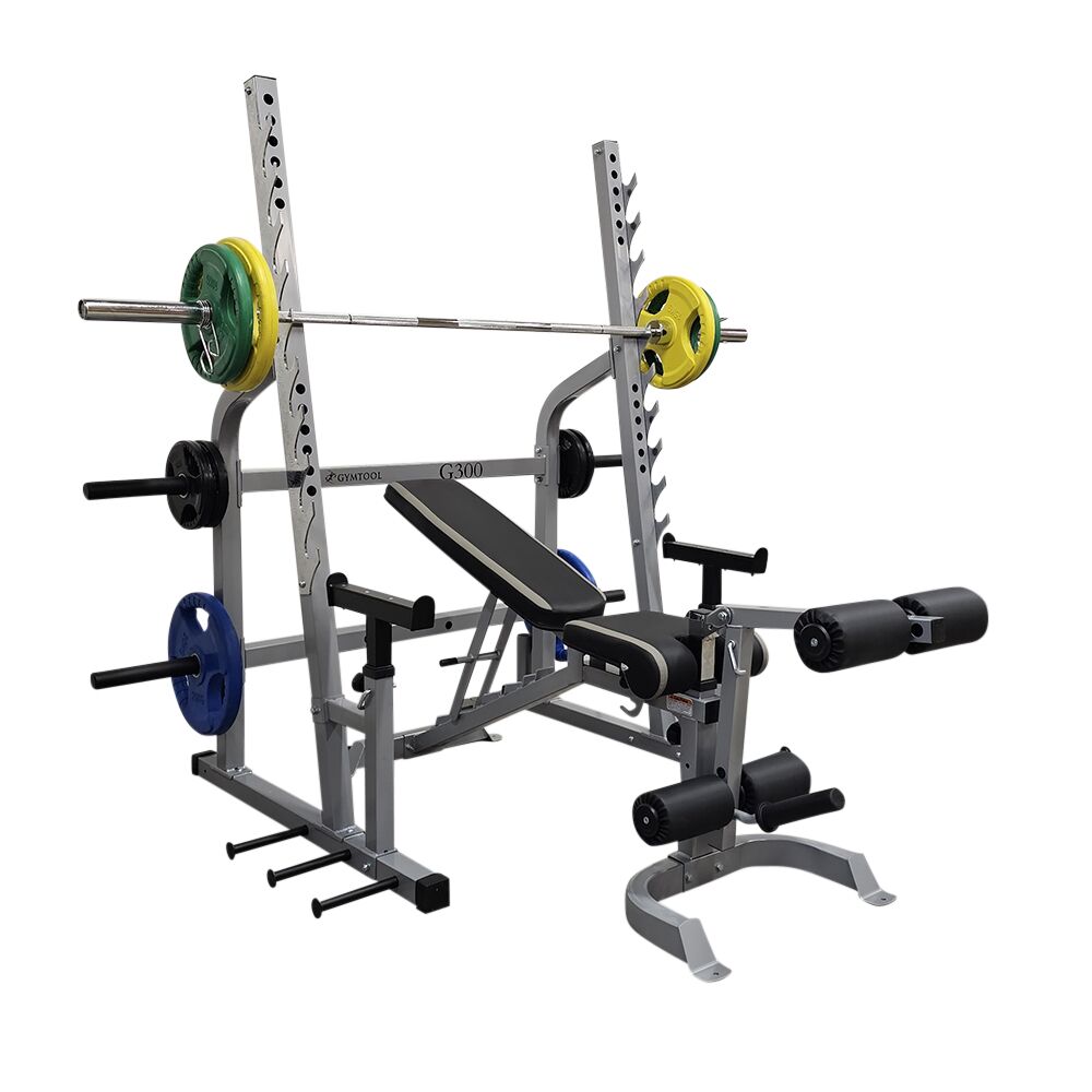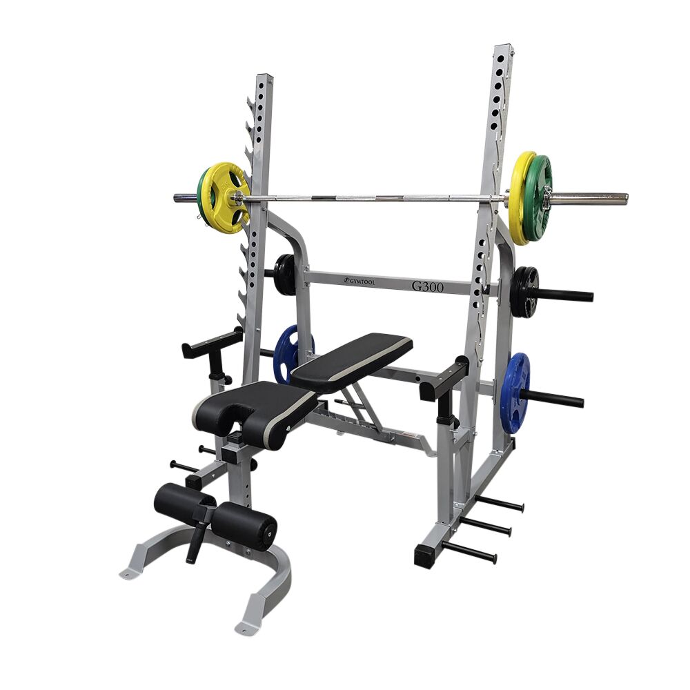G300 squat rack styrkepakke inneholder: G300 squat rack med dips/hang ups, justerbar treningsbenk med benvippe og situps, 220cm olympisk stang med låser og 125kg olympiske vektskiver.
