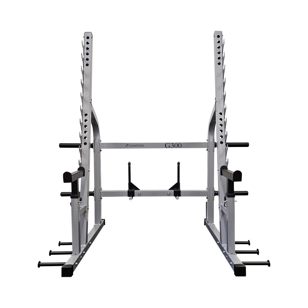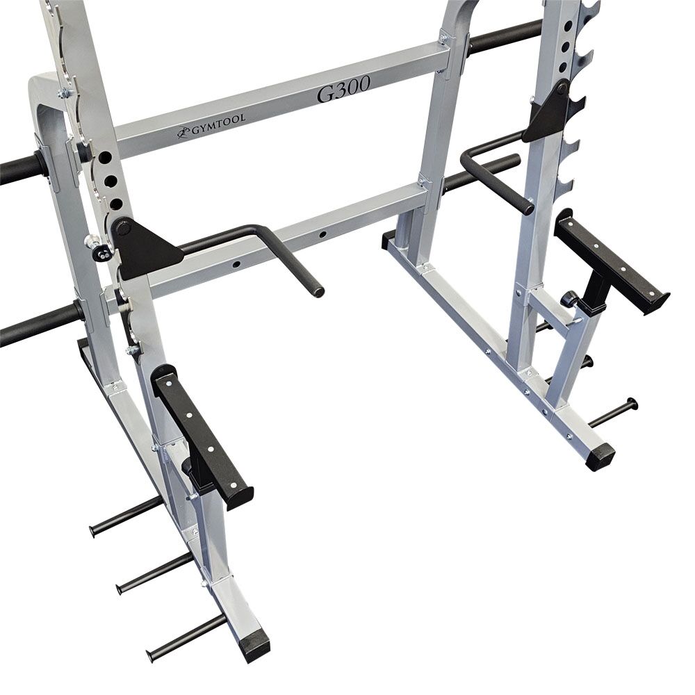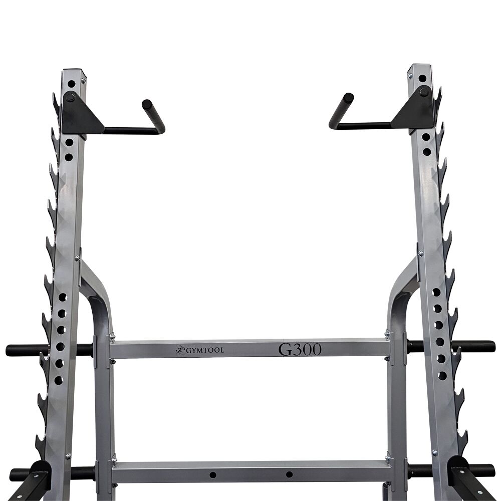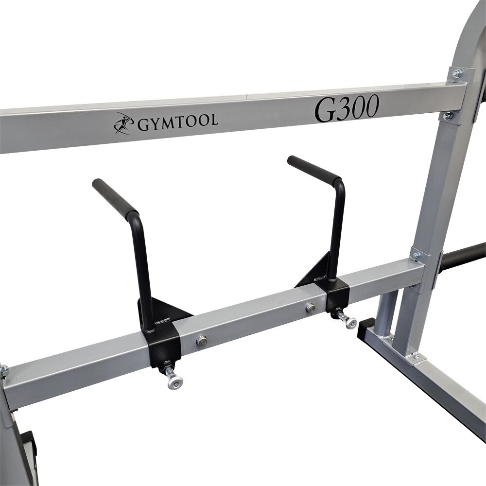 G300 vektstativ med håndtak til dips og pullups. Dette er et kraftig rack vi selv har designet, hvor funksjon, sikkerhet og smarte detaljer har vært fokus. G300 kommer med integrert lagring for vektskiver og vektstang, feste til strikk samt justerbare sikringsarmer. De to tverrgående stagene gjør at racket står meget støtt og føles solid. Dipshåndtakene som følger med kan også brukes i hullene øverst i rammen for chins. Det er også egen lagringsplass for dipshåndtakene bak på tverrstaget.