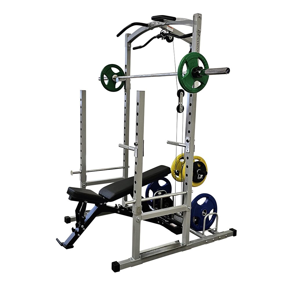 Styrkepakke for hele kroppen: knebøy, benkpress, nedtrekk, roing, dips, chins og mye mer! Følger med benk, stang og vekter.
