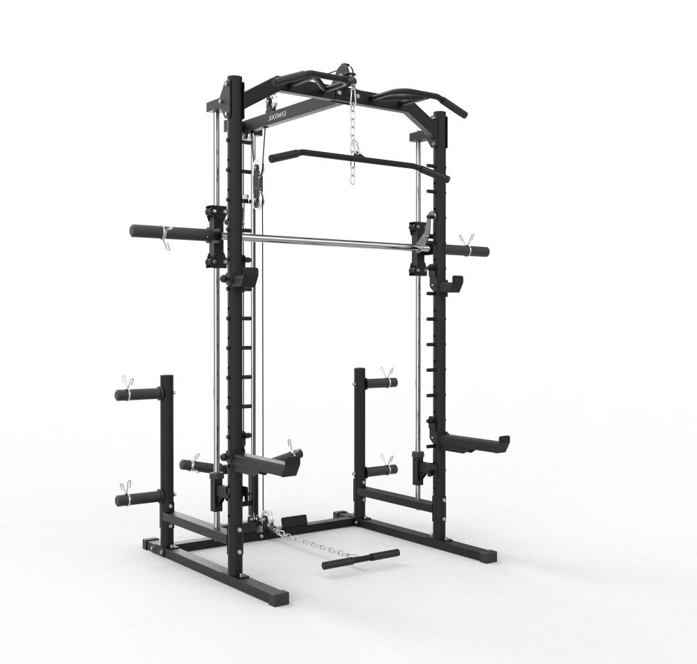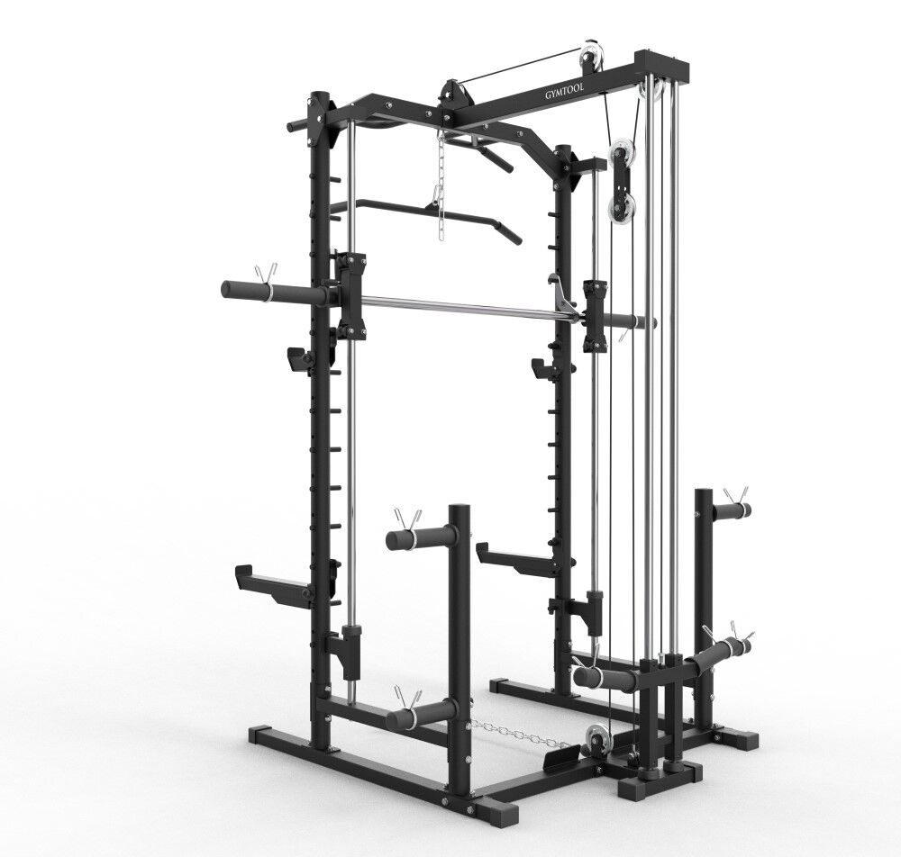 G440 er en rimelig og effektiv multimaskin: Half rack, smithmaskin, nedtrekk, roing og multigrep chins i samme apparat. I denne pakken følger det også med justerbar benk, olympiske vektskiver 125kg + 20kg olympisk vektstang.