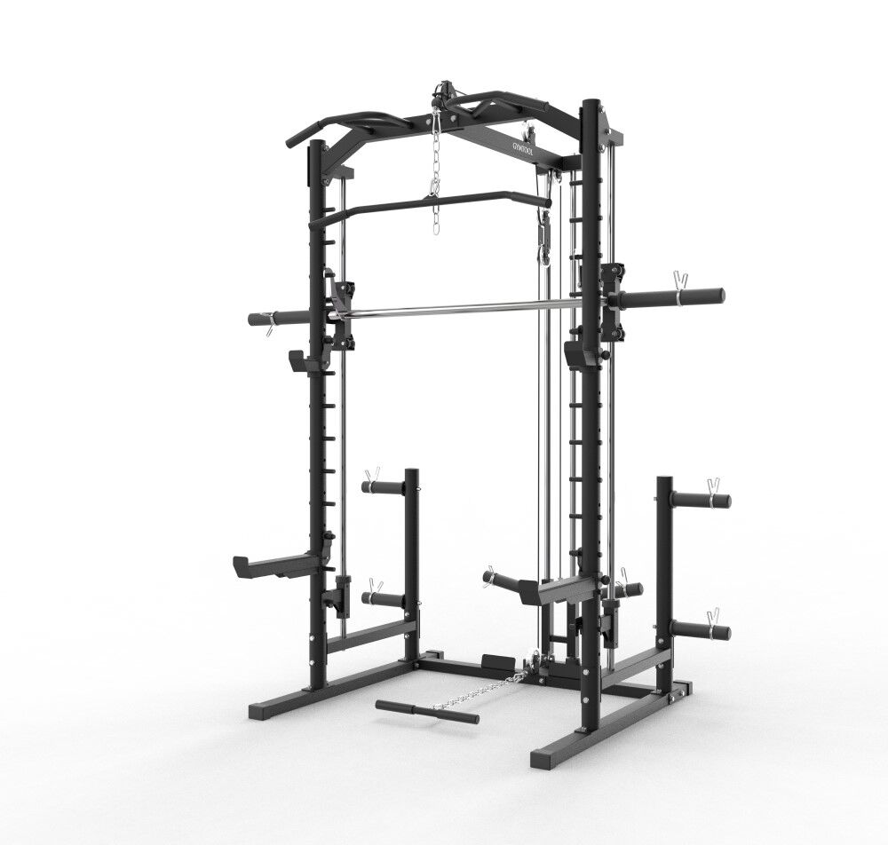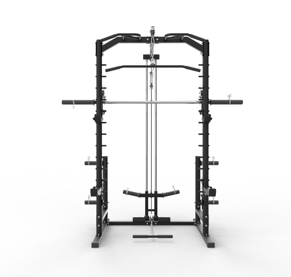 Smithmaskin multiapparat med mange funksjoner: half rack, smithmaskin, nedtrekk, roing og multigrep chins i samme apparat.