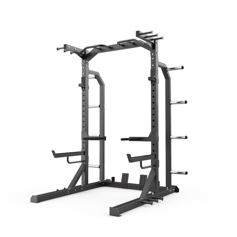 Meget solid half rack for både kommersiell og privat bruk. G500 er en kraftig og funksjonell half rack med justerbare J hooks og sikringsarmer, samt strikkfester og håndtak til dips. Integrert i toppen av rammen er det multigreps pull up stang. Stativet har innebygd 2x oppbevaringsholdere til olympisk vektstang + 8 stk oppbevaringsholdere til olympiske vektskiver. Hovedrammen er produsert med 75x75x2mm stag.