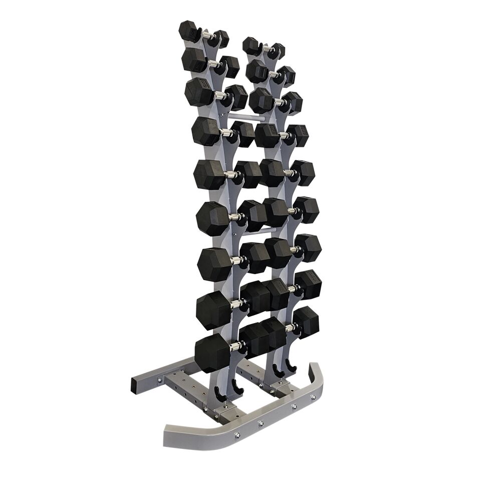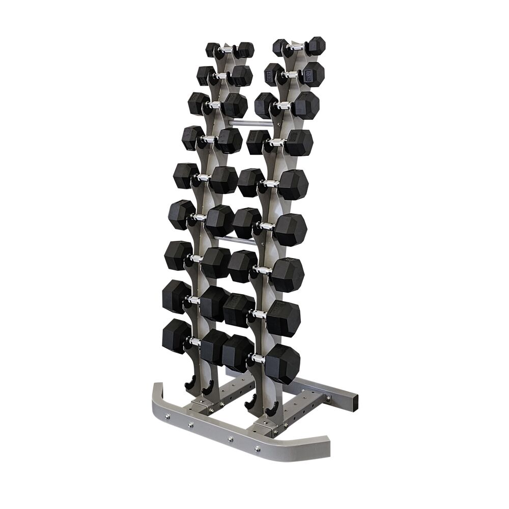 Slitesterke gummierte hex hantler, 2-20kg inkludert solid vertikalt stativ.