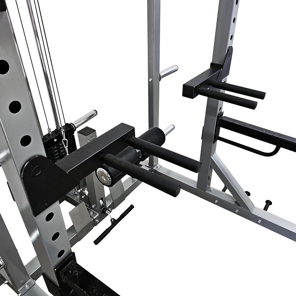 Medfølgende tilbehør: 4 stk J hooks, 2 stk safety arms, 2 stk håndtak multigrip dips, lang stang nedtrekk, kort stang roing