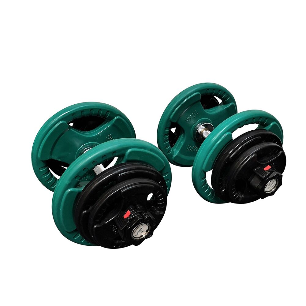 Hver hantel veier 5kg, som gir følgende kombinasjoner av vekt mulig i dette settet per hantel: 5kg, 10kg, 15kg, 20kg, 25kg, 30kg, 35kg og 40kg. Jaw lock låsene sørger for en rask og sikker låsing av vektskivene.