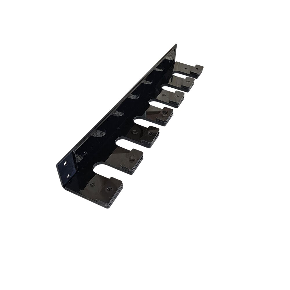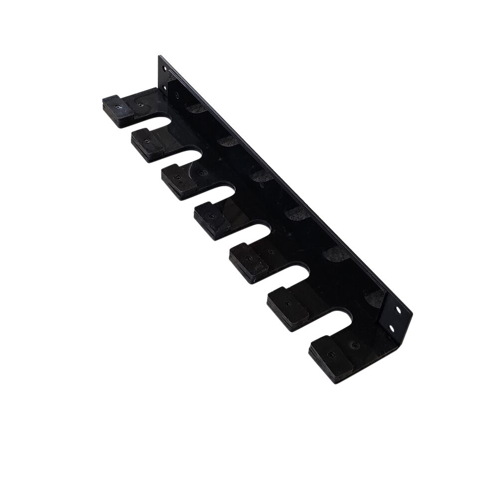 Oppbevaringshylle for veggmontering med plass til 6 stk vektstenger. Det er 60cm fra festehull til festehull vegg. Gummibelagt for skånsom lagring av vektstenger.